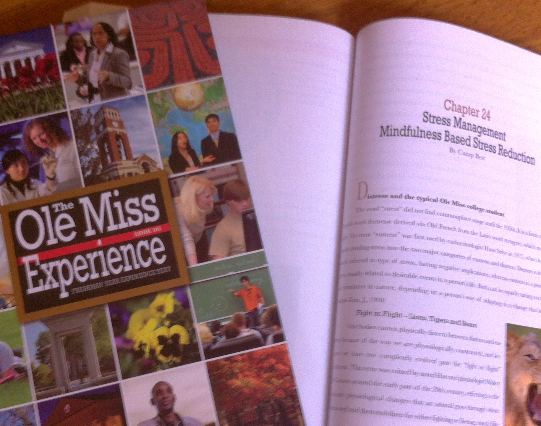 I am fortunate to be able to teach a 3-hour course every fall semester at Ole Miss called First Year Experience (EDHE 105). It is open to incoming freshmen only and is an elective class that focuses upon assisting these students in successfully adjusting to college life. My class is intentionally small and intimate, never more than 20 students. I began teaching this class five years ago, and each year I have gradually increased the emphasis that I place upon integrating mindfulness practices into my pedagogy and into the assignments on my syllabus. We begin every class session by ringing the mindfulness bell and 3 – 5 minutes of mindfulness meditation in silence in which I invite my students to settle in and give themselves permission to just be fully present in my classroom.